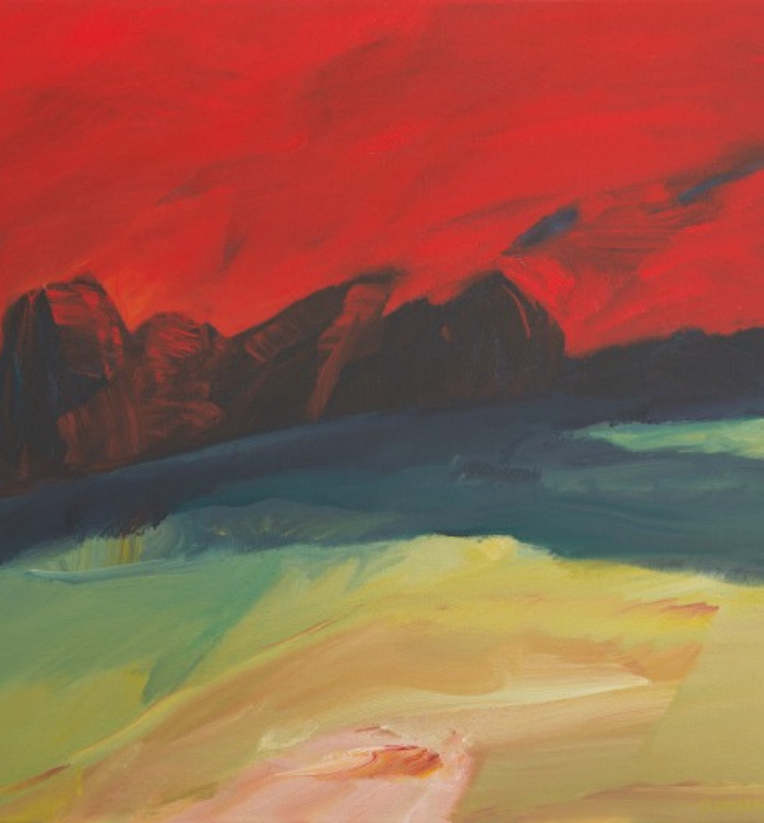 Poster: Dark Form with Red Sky by Dick Evans, 2016, 30” x 30” oil, For SFWC